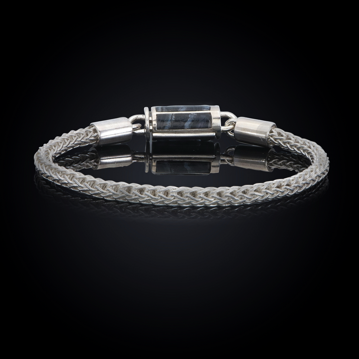 Built on a hand weaved Sterling Silver chain – this accessory is characterised by the four strips of stabilised Mammoth Tooth expertly inlayed into the barrel clasp.